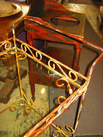 Drinks cart with two glass shelves and iron scroll detail on wheels.
